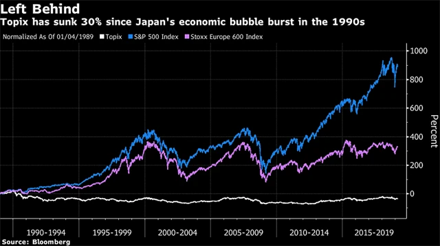 Index japonských akcií TOPIX za zhruba tři dekády od (bublinového) vrcholu na tamním akciovém trhu stále odepisuje okolo 30 %. "Ti, kdo tvrdí, že v 30letých obdobích akcie nemohou ztrácet, by se měli podívat na japonský příklad," uvedl Gundlach.