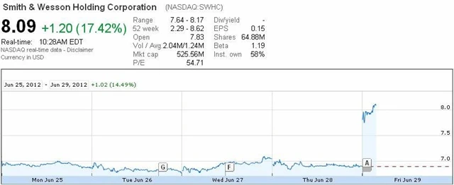 Výrobce zbraní Smith & Wesson oznámil za svůj čtvrtý fiskální kvartál růst tržeb o 27,7 %. Poptávka po zbraních zkrátka v době ekonomického tlaku roste. Akcie reagují strmým růstem.