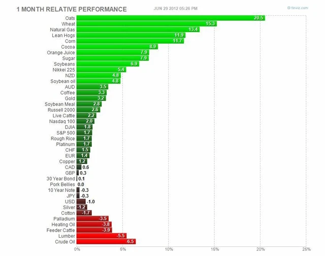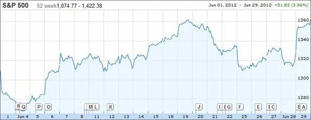 Americké akcie zažily euforický poslední den červnového obchodování a připsaly si nejlepší červnový výsledek od roku 1999 (indexy Dow i S&P 500). Akcie mohou přesto jen závistivě "pokukovat" po zemědělských komoditách, z nichž mnohé během měsíce připsaly dvojciferné zisky. V nemilosti investorů byla naopak navzdory lepší náladě po evropském summitu ropa.