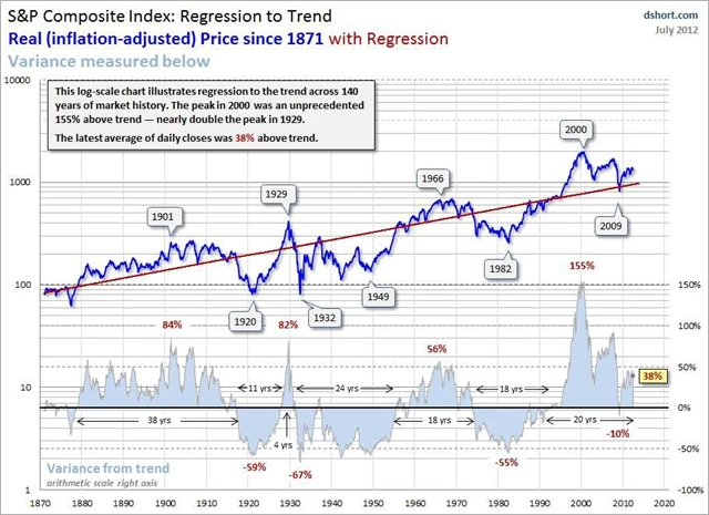 Americké akcie jsou v současnosti stále více než 30 % nad svým dlouhodobým trendem. Ten na svém grafu indexu S&P 500 od roku 1871 zakreslil známý investor Doug Short. Oblasti nad trendem zhruba odpovídají dlouhodobým (sekulárním) býčím a medvědím trhům, v průměru index ročně přidává 1,72 %. Jak ukazuje spodní křivka míry odchylky od 140letého trendu, americké akcie jsou vysoko nad ním, současný trh (medvědí nebo býčí jen podle délky časového rámce) se tedy k němu vrací. Pokud by se S&P 500 držel striktně své růstové přímky, pohyboval by se okolo 955 bodů.