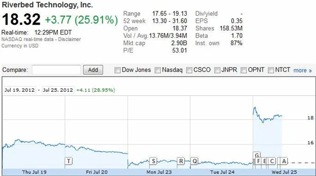 Výsledková sezóna má své vítěze i poražené. Mezi ty s plusovým znaménkem se ve středu zařadila společnost Riverbed Technology. Dobré výsledky, dobrý výhled, zaměření na datová centra - na to investoři v současnosti slyší a akcie Riverbed Technology posilují o 25 %. Menší, méně známé společnosti se silným příběhem sleduje řada investičních profesionálů a "hraje si okolo nich" se svými penězi.