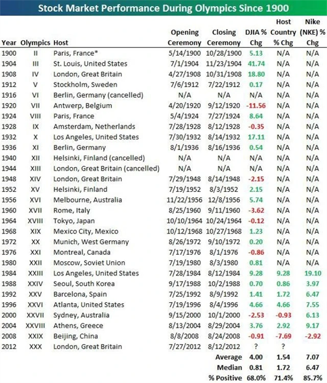 Index Dow Jones Industrial Average od roku 1900 během letních olympijských her, kterých bylo celkem 26, v průměru zaznamenal 4% růst. Rostl v 68 % případů, medián byl skromnější (+0,81 %). Od roku 1984 se velice dobře daří indexům v pořadatelských zemích (průměr +1,54, medián +1,72 %). Jedním ze dvou případů, kdy "domácí" akcie klesaly, byla pekingská olympiáda před čtyřmi lety. Tehdy byl ovšem svět na začátku vleklé ekonomické krize. Zajímavý je i vývoj akcií společnosti Nike, která je jedním z největších dodavatelů oblečení a bot pro sportovce, a je tedy během her hodně vidět.