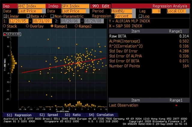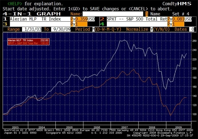 MLPs jsou obecně velmi defensivní tituly a vyznačují se nízkou korelací s trhem. Index AMZ (Alerian MLP Index) zahrnuje 50 nejdůležitějších MLP titulů a od roku 2003 překonal celkovým výnosem index SPX o 100%.