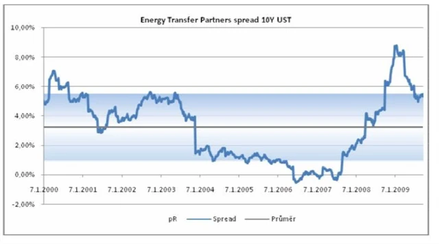 MLPs se běžně obchodují vůči 10-ti letým vládním dluhopisům se spreadem cca 300 bps (3%, pozn. redakce). Během paniky v roce 2008 se spready dostaly do extrémních úrovní a dnes probíhá postupná korekce do normálního pásma v rámci 1 směrodatné odchylky od průměru (viz. např. graf spreadu mezi dividendovým výnosem společnost Energy Transfer Partners a výnosem desetiletých amerických vládních dluhopisů .