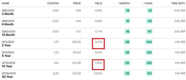 Výnosy amerických vládních dluhopisů (15. 8. 2019), zdroj: Bloomberg