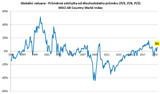 Valuace akciových trhů jsou podle nás globálně relativně atraktivní. Náš kompozitní valuační indikátor je jen mírně v plusu (+5 %). Například loni se pohyboval okolo +15 %. Domníváme se proto, že je prostor pro mírný růst ocenění, což znamená prostor pro růst cen akcií.