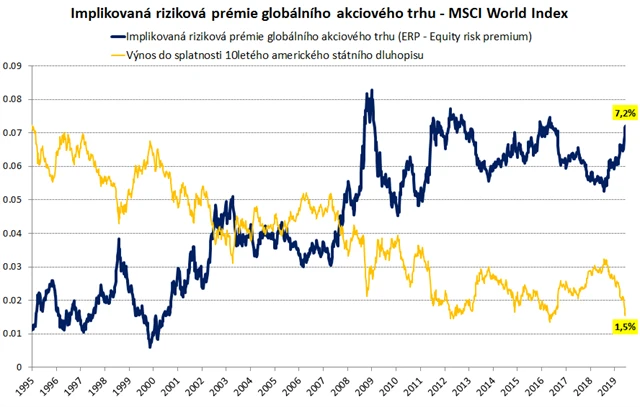 Dalším pozitivním signálem je námi vypočítávaná implikovaná riziková prémie globálního akciového trhu. Ta se momentálně pohybuje na úrovni 7,2 %, nejvýše od srpna 2016. Čím je vyšší, tím jsou akcie atraktivnější. Platí to především ve vztahu k dluhopisům.