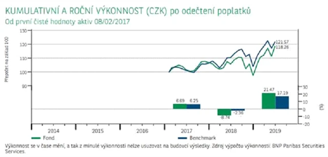 Fond vznikl v červenci 2015, až v roce 2017 však nabídl první výnosy. Za tříletou historii fond prokazuje průměrný roční zisk 7,29 %. V roce 2019 se mu zatím velice daří a od začátku roku se mu podařilo vzrůst o zhruba 20 %. Volatilita fondu je poměrně vysoká (12,63). Benchmarkem je MSCI WORLD (zajištěný do koruny), celosvětový index rozvinutých trhů. V roce 2017 a zatím i letos je fond výkonnější než srovnávací index, což naznačuje kvalitní správu ze strany portfoliomanažera (historie ovšem není zárukou budoucnosti).