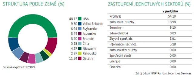 Momentálně má fond zainvestováno do průmyslu (54,1 %), komunálních služeb (18,98 %), surovin a zdravotnictví (pod 10 %). Fond není regionálně zaměřen, v portfoliu má společnosti z USA, Británie, Švýcarska, Japonska, Francie a dalších zemí.