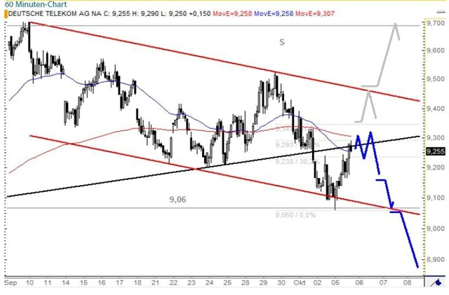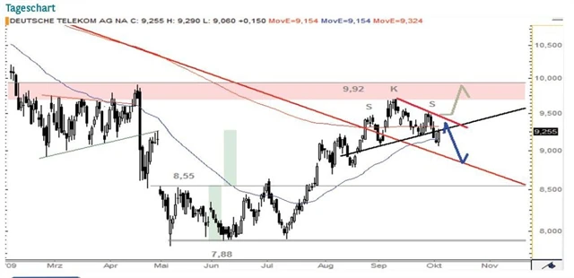 Sentiment je nyní na akciích Detusche Telekom medvědí a pod úrovní 9,45 € hrozí další poklesy kurzů. Vyloučeny nejsou poklesy k 8,80 € a 8,50 €.