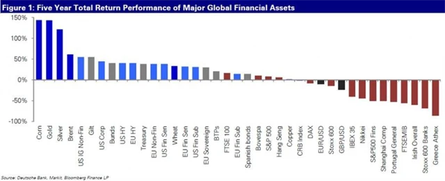 Minulý týden si svět připomněl páté výročí začátku hypotéční krize, které svými důsledky ovlivňuje světovou ekonomiku dodnes. Jim Reid z Deutsche Bank při té příležitosti sestavil graf celkové výkonnosti jednotlivých tříd aktiv za období těchto pěti let. Nejlépe na tom díky růstu z posledních měsíců byla kukuřice, další příčky ovšem patří stabilně "bezpečným" investicím - zlatu a stříbru.