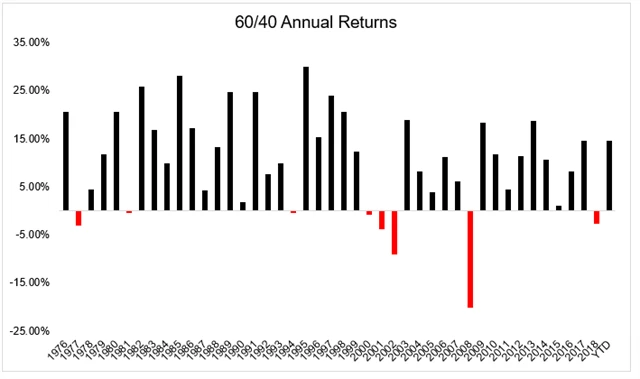 Tradiční mix amerických akcií a státních dluhopisů v poměru 60/40 vydělal investorům od roku 1976 10,15 % ročně, přičemž v 35 z 43 let dosáhlo kladného zhodnocení.