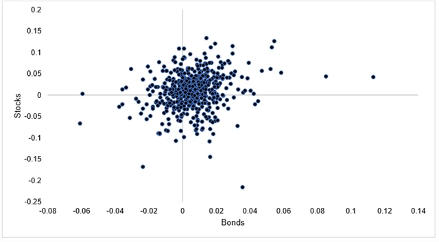 Podle očekávání by hlavním důvodem úspěchu mělo být to, že když akcie posilovaly, dluhopisy nevydělávaly, zatímco když akcie padaly, zisky na trhu s bondy dokázaly tyto propady částečně eliminovat. Jenže skutečnost je trochu jiná, což ukazuje graf kombinovaných výnosů z držení akcií a dluhopisů na měsíční bázi.