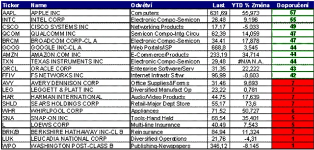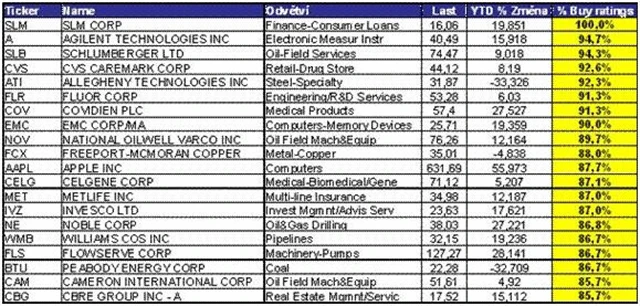 Z následující tabulky je zřejmé, že nejpopulárnější akcií z indexu S&P 500 je SLM Corporation, kterou doporučuje k nákupu 100 % analytiků, kteří ji pokrývají. Na druhém a třetím místě jsou akcie firem Agilent Technologies (94,7 %) a Schlumberger (94,3 %). Z výsledků je dále zjevné, že portfolio prvních 20 firem je poměrně slušně diverzifikované. Mírnou převahu má pouze energetický sektor.
