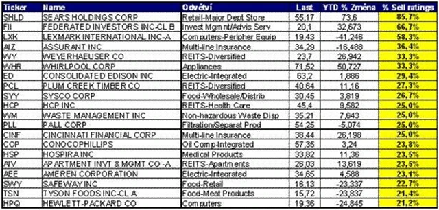 Nejméně populární akcií mezi analytiky je společnost Sears Holdings, kterou doporučuje k prodeji 85,7 % hodnotitelů. Na druhém místě je společnost Federated Investors (66,7 %), na třetím Lexmark International (58,3 %).