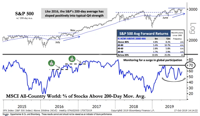 A může to platit i globálně, nejen na trhu v USA. 59 % titulů zahrnutých ve světovém indexu MSCI se obchoduje nad 200denním klouzavým průměrem. Přitom když se tento podíl od roku 1995 pohyboval v rozmezí 60-80 %, ústilo to v následujících 6-12 měsících v nadprůměrný růst indexu S&P 500. To je minimálně námět k přemýšlení v záplavě denních zpráv.