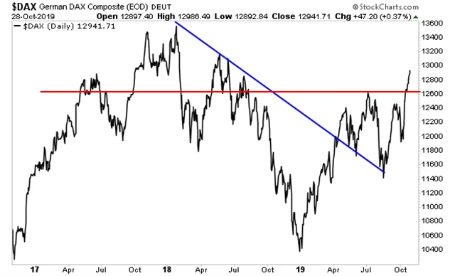 Německý index DAX je sice od maxim ještě poměrně daleko, ale poměrně zřetelně zvrátil střednědobý sestupný trend.