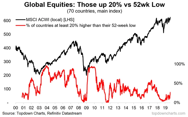 Roste počet jednotlivých národních akciových trhů na 52týdenních maximech.