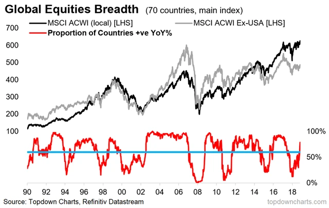 A optimismus nevzbuzuje jen krátkodobý vývoj jednotlivých akciových trhů. I globální akcie naznačují obrat, jak upozorňuje Callum Thomas z TOPDOWN CHARTS. Upozorňuje na rostoucí počet (a podíl) jednotlivých národních trhů, které splňují "býčí" charakteristiky.