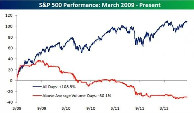 Jak vypočítali analytici z Bespoke Investment, ve dnech, kdy je objem obchodů podprůměrný, opravdu dochází k většině růstu. Pokud by se počítaly jen dny s nadprůměrnými objemy obchodů, akcie by od svého dna v březnu 2009 dokonce ztratily přes 30 %. Nahoru opatrně, dolů v panice hezky hromadně - tak se v současnosti chová akciový trh.