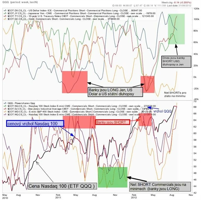 Významný cenový vrchol u akcií je zřejmě zatím v nedohlednu. Sázel bych znovu na růst cen po nějakém kratším horším období. Avšak pozice commercials u jednotlivých futures ukazují, že jsou banky nyní zajištěny ve velké míře proti poklesu u akcií, dluhopisů, dolaru i jenu.
