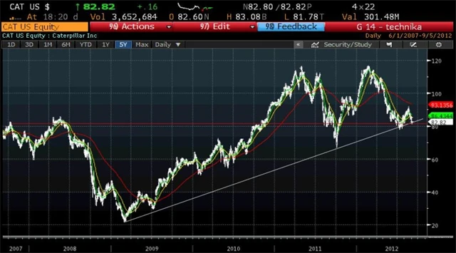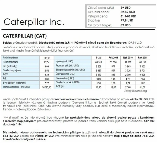 Doporučení je aktuální k 5. září 2012, od té doby se akcie Caterpillaru i nálada na trzích mohly výrazně posunout.