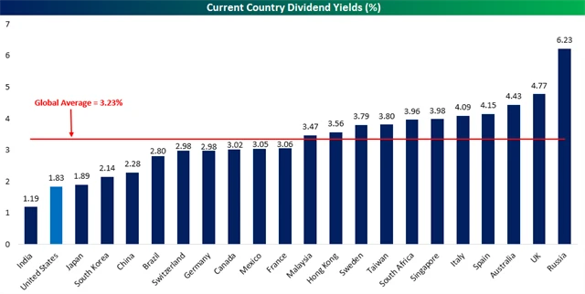 První graf shrnuje dividendové výnosy celých národních trhů. Tradičně na špici je Rusko, velice solidní výnosy ale nabízejí i burzy v Británii, Španělsku nebo Itálii. Částečně i výrazný růst cen akcií drží zpátky výnosy na americkém trhu, na chvostu je i Japonsko.