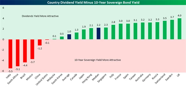 Typický dividendový investor bývá dlouhodobý. Nakoupí akcie firmy, která vyplácí dividendy, a drží je dlouhá léta. Totéž ale často platí o investorech do dlouhodobých dluhopisů. Benchmarkem jsou v tomto směru 10leté cenné papíry. A (nejen) jejich výnosy jsou v USA a v zemích eurozóny již léta tlačeny níže politikou centrálních bank. A proto jsou mnohé z těchto zemí výrazně atraktivnější na úrovni dividend než výnosů vládních bondů.