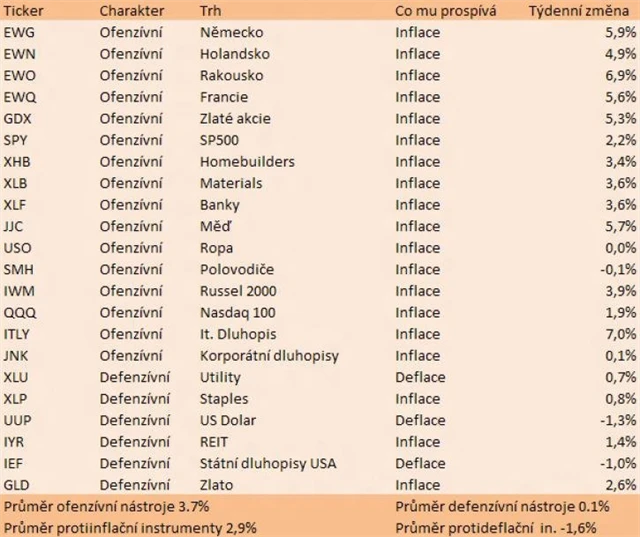 Bankéřům se jejich záměry daří naplňovat. Inflace je na vzestupu, ceny rostou. A zřejmě i porostou. Nelze očekávat změnu. Největší růst zaznamenávají riziková aktiva, která jsou zároveň ochranou proti inflaci. Defenzivní aktiva a aktiva dobře fungující v deflačním prostředí jsou vyprodávána. Všimněte si italského státního dluhopisu ITLY - cena dluhopisu rostla spolu s proinflačními aktivy o 7 % za týden.