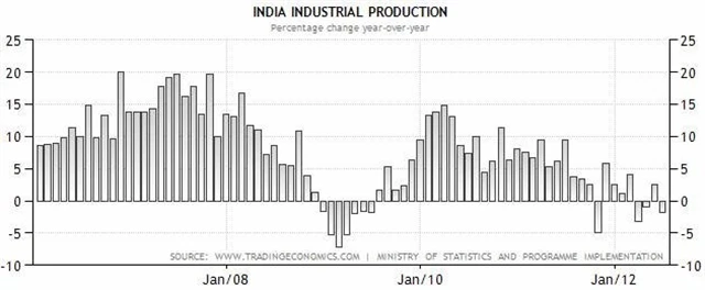 Růst indického HDP se pohybuje okolo 5 %, což je na druhou nejlidnatější ekonomiku velice málo. Průmyslová výroba aktuálně dokonce meziročně klesá.