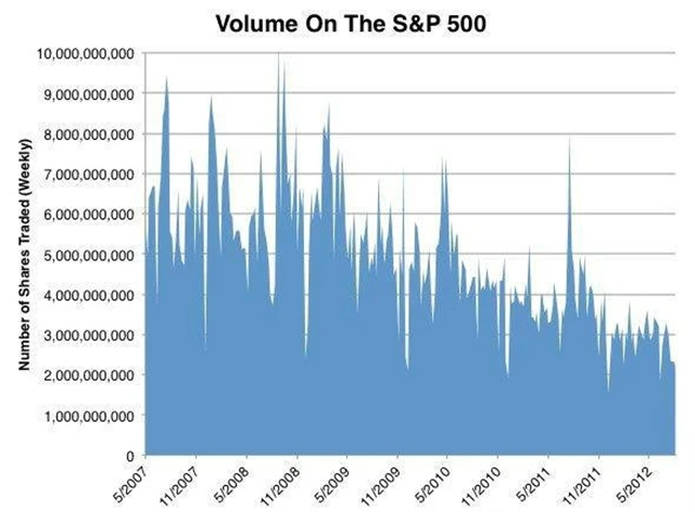 Výsledkem výše zmíněných a řady dalších faktorů je stále nižší objem obchodů s akciemi. Důvěra investorů je otřesena, velké fondy se stále drží konzervativních strategií, k nechuti drobných investorů sázet na akcie přispívají i nejasnosti spojené s vysokofrekvenčními obchody, které vedly k několika takzvaným "flash crashům".