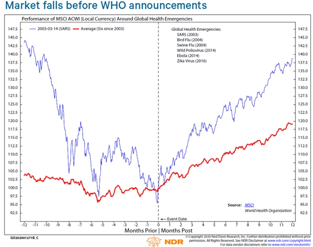 Společnost Ned Davis Research se ponořila do historických dat a vyčetla z nich, že jakmile Světová zdravotnická organizace (WHO) vydala globální výstrahu (přesně se jí říká globální stav zdravotní nouze) před nějakou nemocí či epidemií, pro investory to v dohledné době znamenalo nákupní příležitost. Analýza se týkala výkonnosti akcií po vypuknutí předchozích globálních epidemií, mimo jiné SARS v roce 2003 nebo viru zika v roce 2016. A Ned Davis Research zároveň připomíná, že samozřejmě zároveň docházelo k dalším událostem, které ovlivňovaly dění na trzích.