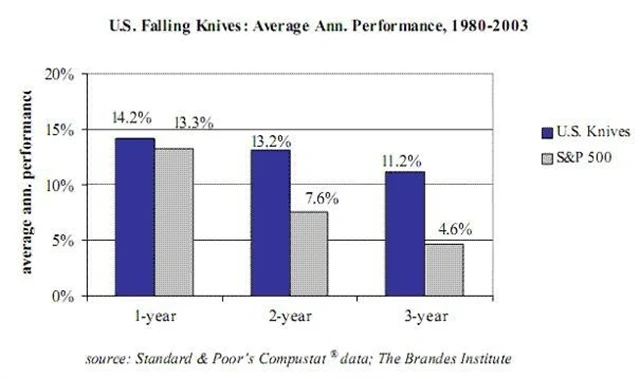 V USA bylo v daném období identifikováno 1 904 titulů, které splňovaly výše uvedené charakteristiky. Jejich výkonnost byla v horizontu 3 let o poznání vyšší než v případě akciového indexu S&P 500. Studie dále odhalila, že procento zbankrotovaných firem bylo ve zkoumaném vzorku mnohonásobně vyšší oproti průměrným hodnotám. Z výsledků dále vyplývá, že nadprůměrná výkonnost vůči indexu byla způsobena malým množstvím akcií, jejichž cena vystřelila strmě vzhůru. V průměru překonaly Falling Knives index o 6,6 procentního bodu. Pokud ovšem vezmeme medián, zjistíme, že zkoumaný vzorek zaostal v horizontu tří let za indexem o 7,7 procentního bodu zhodnocení.