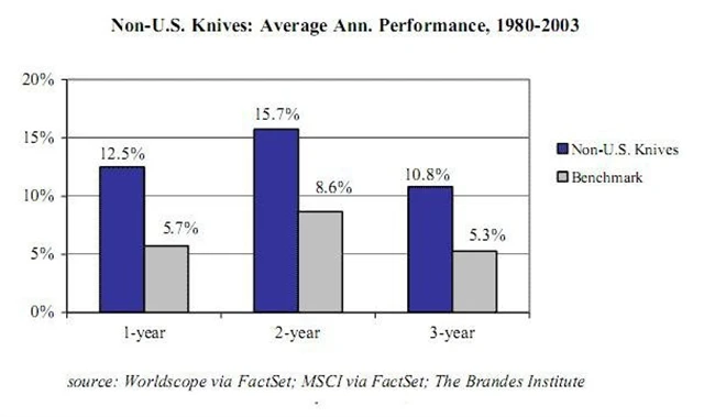 Průměrná roční výkonnost Falling Knives mimo USA v období 1980-2003 (Zdroj: Brandes Institute)