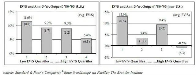 Ve studii bylo dále zkoumáno, zda lze výsledky vylepšit pomocí ukazatele EV/S (Enterprise-value-to-sales), který měří hodnotu podniku k jeho tržbám. Akcie byly rozděleny do čtyř skupin podle velikosti výše uvedeného ukazatele. Bylo zjištěno, že podniky s nejnižší hodnotou ukazatele překonávají index o poznání více než firmy s vysokými hodnotami. Nejlépe se dařilo prvnímu kvartilu s průměrnou hodnotou ukazatele 0,8, který překonal index o 11,6 procentního bodu.