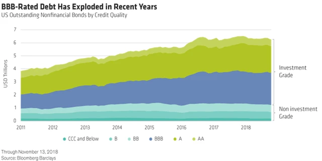 V USA zase v posledních letech hodně roste dluh společností s ratingem BBB, tedy nejnižším investičním. Z celkového korporátního dluhu v USA tvoří tyto dluhopisy kolem 40 %, což může v budoucnu znamenat velký problém.