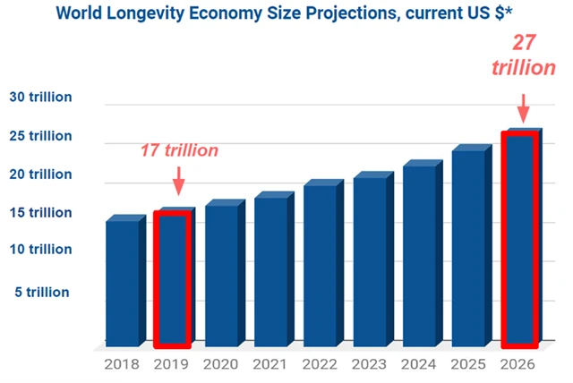 Petr Šrámek, zakladatel Longevitytech.fund, vidí velkou příležitost v sektoru longevity, který zahrnuje zboží, produkty, služby a pokrytí potřeb lidí z nejrychleji rostoucí demografické skupiny na světě, tedy nad 50 let. Tato skupina roste čtyřikrát rychleji než celosvětová populace a její podíl na globálním HDP je 17 bilionů USD. Do roku 2026 to bude 27 bilionů, což je nárůst o 50 %, který je z historického hlediska bezprecedentní.