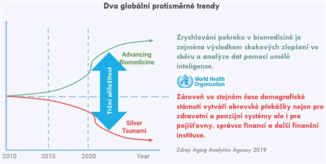 Tento trend na jednu stranu vytváří rizika spočívající ve zpomalování produktivity lidí starších 50 let, kteří se stávají hrubými příjemci peněz ze zdravotních a penzijních systémů (což povede k selhávání těchto systémů). Zároveň ale dochází k rychlému pokroku v medicíně nebo biotechnologiích, které již dokáží zmírňovat pokles produktivity, například prodlužováním aktivního věku lidí (i když to nemusí nutně znamenat odkládání odchodu do důchodu). Kombinace těchto dvou faktorů vytváří zajímavou příležitost pro firmy působící v této oblasti.