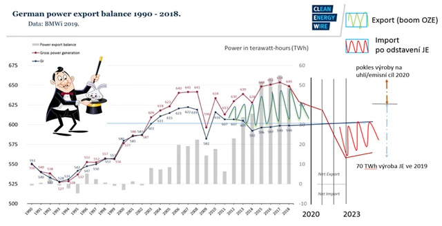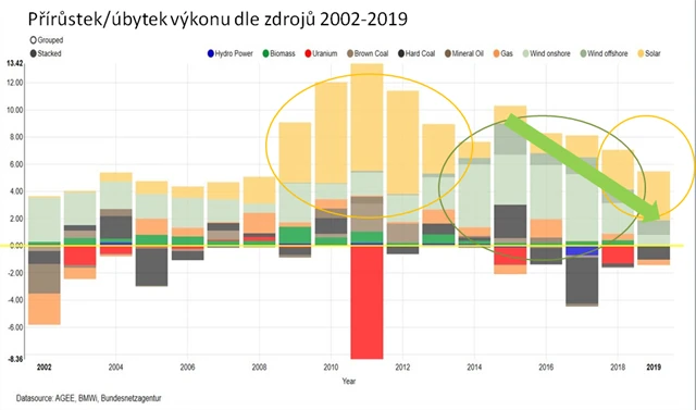 Díky růstu výkonu obnovitelných zdrojů (OZE) vznikl v minulých letech ohromný přebytek energie a Německo mohlo elektřinu exportovat ve velkém. Pokles instalovaného výkonu nových OZE (nyní již investice do nich nejsou tak výhodné jako v minulosti) a vypnutí jaderných elektráren povedou k nedostatku energie v regionu, protože Německo se může stát z exportéra energie čistým importérem. A cena energie v důsledku toho rychle poroste.