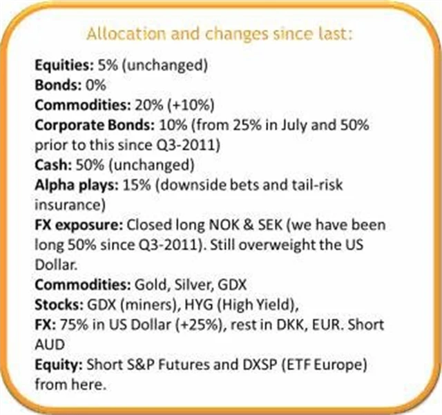 Měny: 75 % USD, zbytek DKK a EUR. Short AUD