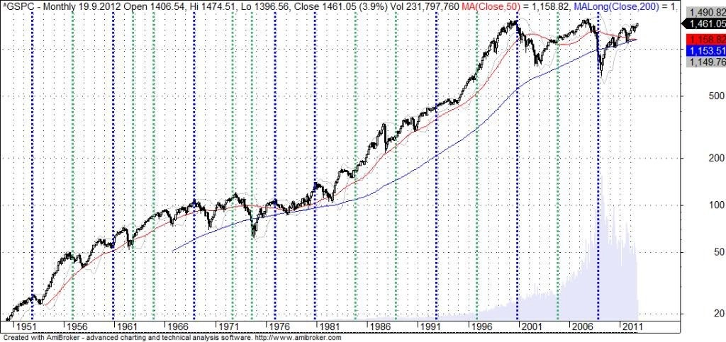 Pojďme se podívat na graf, jak to je ve skutečnosti. Na obrázku je měsíční graf S&P 500 (logaritmické měřítko). Modrými svislými čarami jsou naznačeny volby, v nichž zvítězil prezident z opačného tábora, než byl ten dosavadní. Zelenými svislicemi jsou naopak naznačeny volby, v nichž zvítězil prezident ze stejné strany jako ten předchozí.