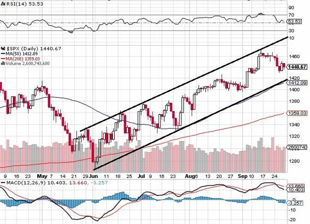 Dokud se index S&P 500 pohybuje v rostoucím kanálu, platí býčí trend. Pokud uzavře pod hodnotou 1 395, situace se změní v prospěch medvědů.