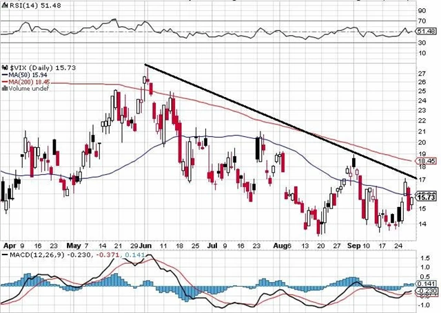 Index volatility VIX se ve středu přiblížil ke klesající trendové čáře. Podstatné je, že ji neprolomil a zůstává pod ní. To je pro akcie pozitivní signál. Jakmile VIX vystoupá nad klesající trendovou čáru a začne formovat novou rostoucí formaci, tedy půjde nad hodnotu 19, případně i nad 21, potvrdí změnu nálady na akciovém trhu.