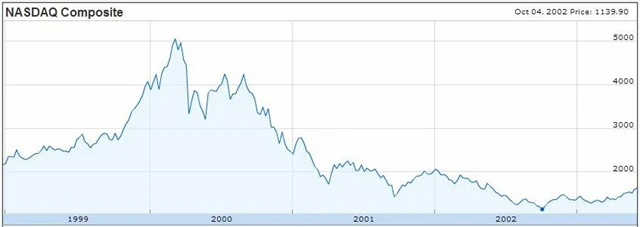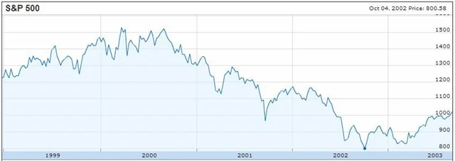 Dow Jones padal do října 2002. Z téměř 12 tisíc na 7 tisíc bodů. Začátkem roku 2002 skandál Enronu a reakce na něj ve formě Sarbanes-Oxley Act odlákaly pozornost investorů od internetového šílenství, medvědího trhu a recese mezi roky 2000 a 2002.
