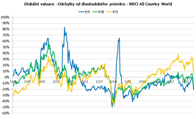 Valuace globálních akcií, tedy vztah jejich cen k fundamentům, jako jsou tržby, zisky a cash flow, se v důsledku hlubokých a prudkých propadů dostaly na nebývale nízké úrovně (více ZDE). Toho jsme využili a výrazně jsme navýšili svou globální akciovou expozici. Současná ocenění podle nás již indikují v dlouhodobém investičním horizontu vysoce nadstandardní zhodnocení.