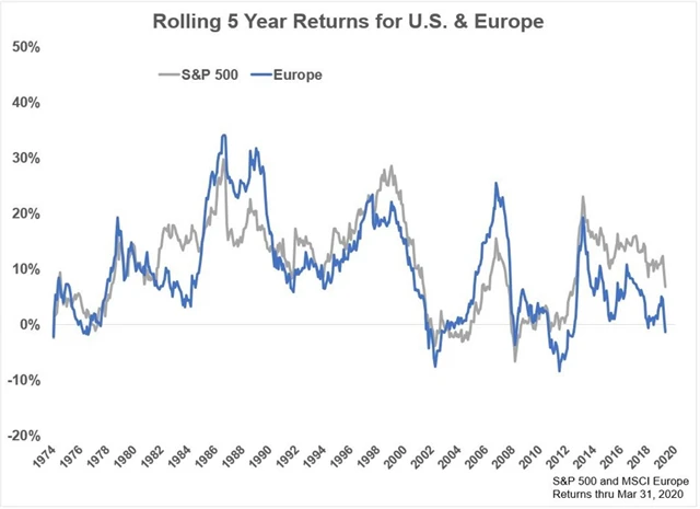 Evropské akcie podávají přibližně od roku 2014 podstatně slabší výsledky než ty americké. V pětiletém horizontu navíc zaznamenávají mírné ztráty. Takový obrázek není příliš častý, od roku 1970 byly v 5letém horizontu ve ztrátě evropské akcie jen ve zhruba 11 % sledovaného období.