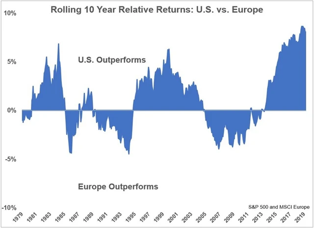 Ještě smutnější pohled pro investory na evropských burzách nabízí tento graf, který ukazuje rozdíly ve výkonnosti amerických a evropských titulů v desetiletém horizontu. V současnosti je nadvýkonnost amerických akcií dokonce nejvýraznější minimálně od konce 70. let 20. století.