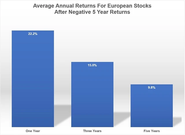 Chuť zanevřít na akcie, zejména ty evropské, může být obrovská, investoři by ale měli zkrotit emoce a připomenout si, že trhy jsou cyklické a poklesy jsou střídány růsty. Ztracená bitva rozhodně neznamená prohranou válku. Důkazem může být například následující graf, který dokazuje, že v případě evropských trhů bývá pokles akcií v pětiletém horizontu následován relativně silnými růsty v letech následujících.