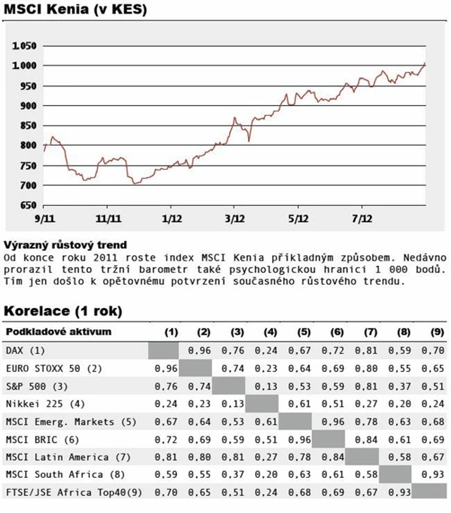Již v březnu 2010 uvedla RBS na trh Kenya Tracker. Tento cenný papír je zástupcem rodiny indexů MSCI. Od své emise dosáhl certifikát performance okolo 15 %. To není na první pohled ohromující. Ovšem jednoroční performance přesáhla 50 %, čímž Keňa překonala nejen všechny etablované trhy, nýbrž také všechny prosperující země ze segmentu emerging markets.