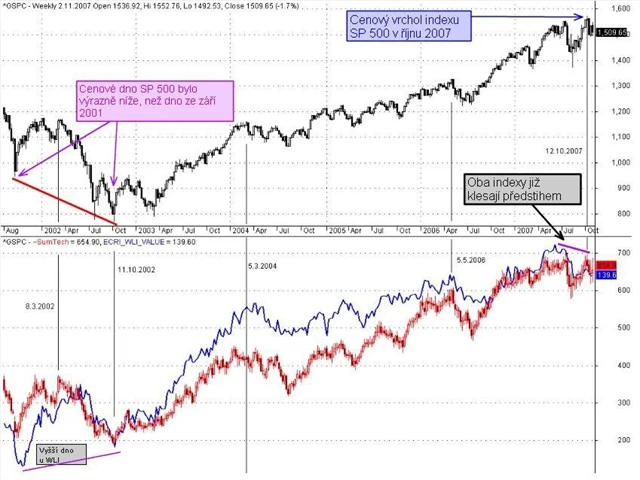 Nejprve historie (vývoj v letech 2003 až 2007). ECRI je zobrazen modře, SMART index červeně, nahoře je index S&P 500. Oba indikátory dokázaly s předstihem v roce 2002 ukázat, že se blíží lepší období pro ekonomiku i akciové trhy. Index WLI vytvořil své dno s ročním předstihem, SMART index vytvořil za stejné období dvojité dno. Během růstu akciových trhů v letech 2003 až 2007 se oba indikátory vyvíjely v podstatě podobně jako akciový index S&P 500. Změna nastala před cenovým vrcholem v říjnu 2007 (pravý horní roh grafu), kdy se oba leading indikátory začaly odchylovat od akciového indexu S&P 500. Začaly klesat o tři měsíce dříve.